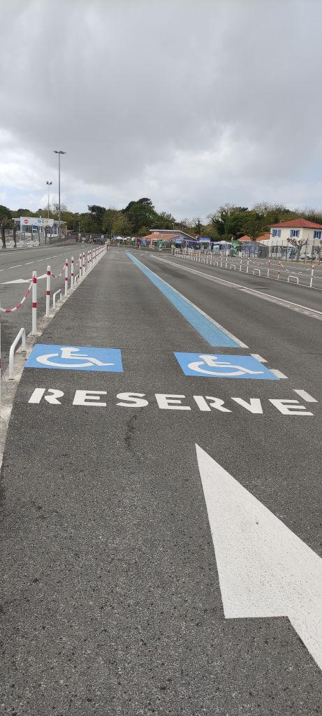 - Handicap visuel : une bande de guidage visuel avec des dalles podotactiles relie la place de parking PMR à l'emplacement assis à bord.