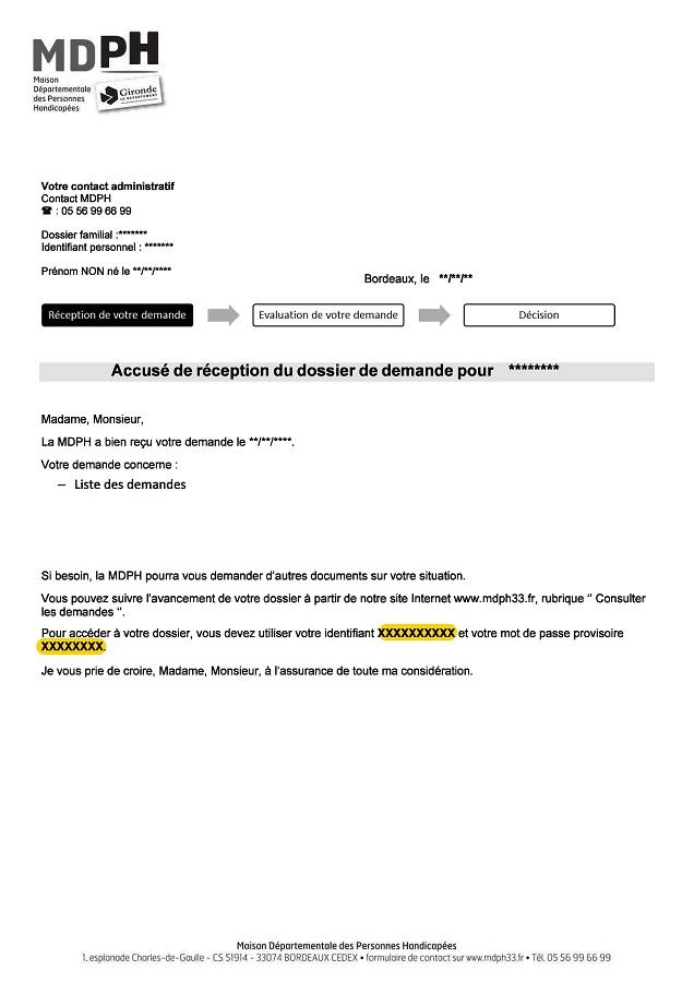 Dès que vous avez déposé un dossier à la MDPH, vous recevez un courrier du département de la Gironde indiquant votre numéro d’identifiant à 10 chiffres et mot de passe pour accéder à votre espace personnel Mon compte sur le site internet gironde.fr. Ces codes d’accès sont confidentiels.